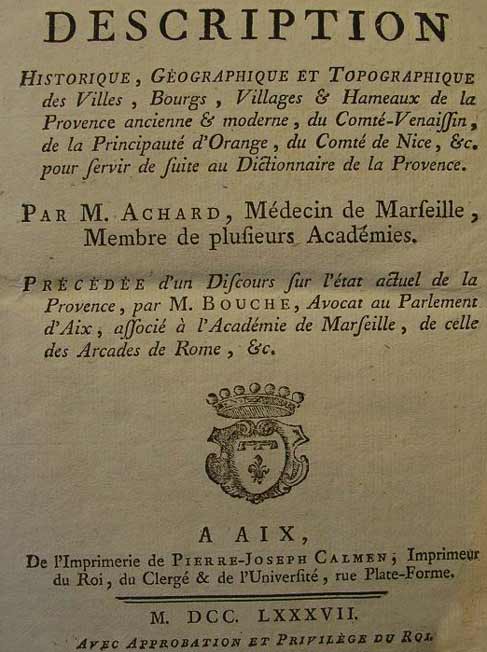 ACHARD, Claude François. Né en 1753 à Marseille, Achard Claude François était docteur en médecine. Mais c'est en tant que chercheur et bibliophile qu'il est connu . Cet érudit était secrétaire de l'Académie de Marseille et gèrait la bibliothèque de cette ville, où il s'éteint en 1809. Il a laissé un Dictionnaire de la Provence et du Comtat Venaissin, contenant un lexique français et provençal et l'histoire des hommes illustres de la Provence, publié en 4 volumes à Marseille, de 1785 à 1787, une Description historique, géographique et topographique de la Provence et du Comtat Venaissin (Aix, 1787), et d'autres ouvrages sur Marseille. |