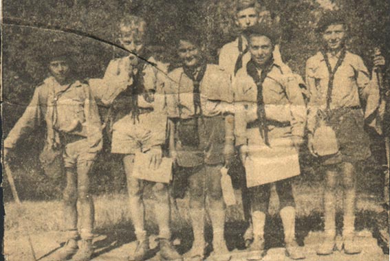 Coupure de journal. Les scouts en camp d'été, la patrouille des Panthères : Alain Marcel, Stéphane Blasini, ..., Michel Portal, Victor Codoul, derrière: Pierre Luraschi