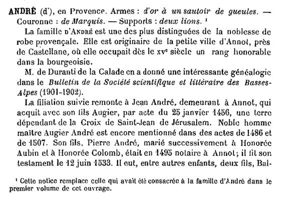 Extraits de: Dictionnaire des familles françaises anciennes ou notables à la fin du XIXe siècle , par Gustave Chaix d'Est-Ange (1863-1923)