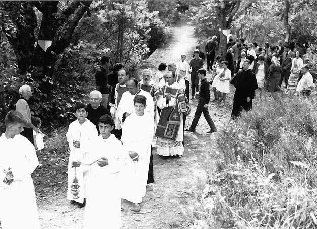 Procession à Saint Ferréol vers 1965 au centre portant la barbe le père Girard Pellegrin qui fut supérieur de la maison de Lorgues de 1962 à 1974.