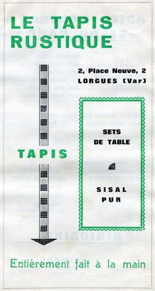 Créé par Marc Gobert dans les années 60, le Tapis Rustique a fait travailler pendant une quinzaine d'années de nombreuses lorguaises qui réalisaient chez elles les différents motifs en sisal , ceux-ci étaient ensuite assemblés pour élaborer les tapis. |
