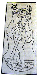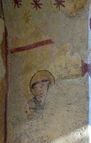 | Les autres peintures qui ornent les côtés intérieurs des piliers du porche ne valent pas celles-ci : ce ne sont que des traits sans ombre et des couleurs sans nuances. Cependant il n'y a rien de grotesque et les proportions sont assez bien gardées. Elles offrent un véritable intéret à cause des sujets qui y sont traités et qui sont empruntés à la vie des saints ou au dogme des vérités éternelles. On en jugera par nos reproductions qui sont très fidèles lorsque nous avons pu trouver le trait primitif. Parmi les images des saints il y a: | ||