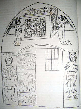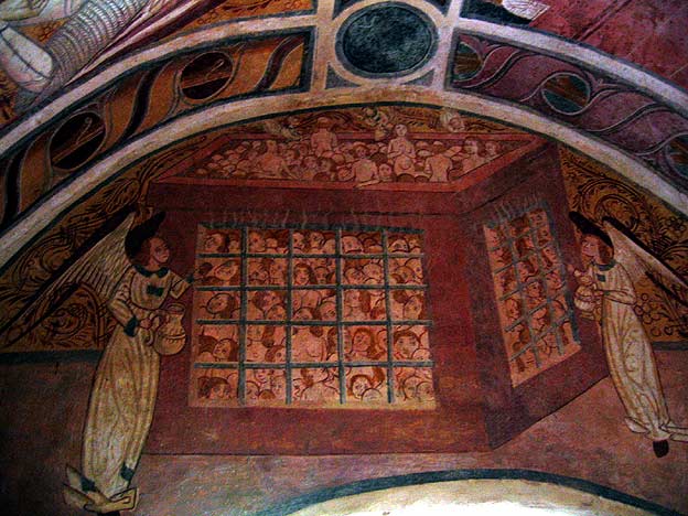 | Sur le mur de la porte ; il y a le Purgatoire : c'est une espèce de cage remplie de personnages. Deux anges se tiennent aux côtés, portant des amphores, comme pour procurer aux âmes les rafraichissements obtenus par les prières des vivants. | |