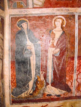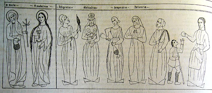 Sous le ciel: sainte Marthe, sainte Madeleine; puis les vertus : Diligence, Abstinence (c 'est une Charité), Tempérance, Patience, Pénitence, Aumône» .