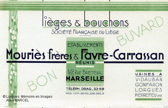 | Ci-dessus, un buvard publicitaire des établissements Mouriès. L’entreprise avait un bureau de diffusion à Marseille. Gaston Mouriès, petit fils du fondateur Trophime Mourriès épousa en 1908 Isabelle Carrassan, fille d’une famille de bouchonniers de Gonfaron. De ce rapprochement naquit la Société française du liège à laquelle s’associèrent d’autres bouchonniers. Gaston Mouriès fut un des propriétaires du château de Sainte-Foy. " |
