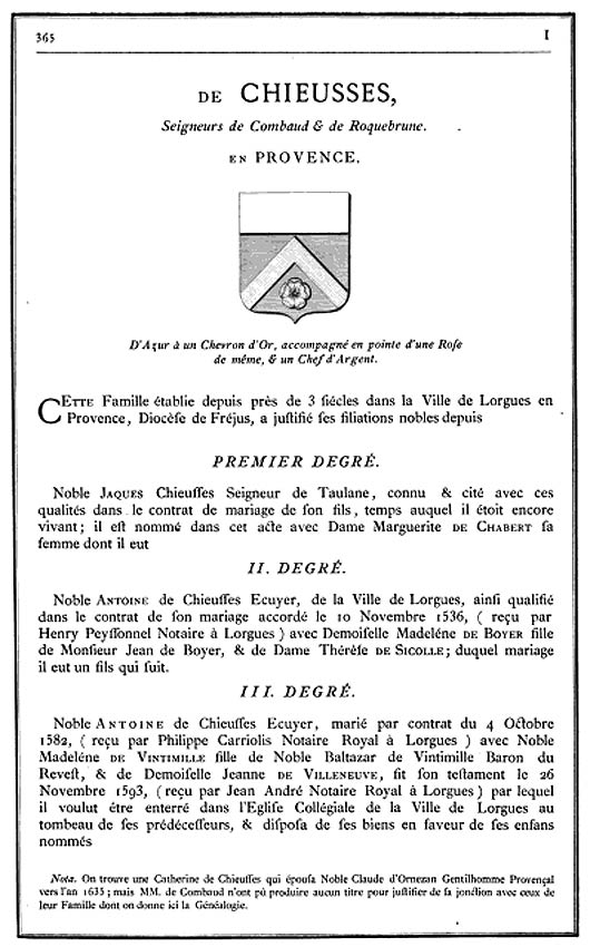 D'Azur à un chevron d'Or, accompagné en pointe d'une Rose de même, & un Chef d'Argent.
