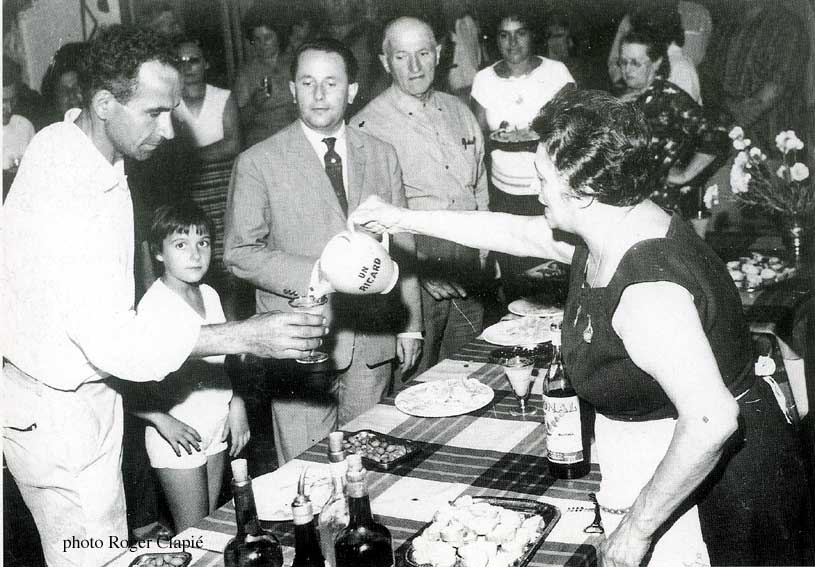 Madame Scoto, du bar Le Provença , sert un pastis à M. Fabret sous l'oeil attentif du maire Pierre Viton.