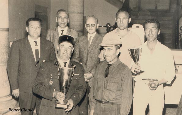 Remise de coupes à la mairie. 1er à gauche André Négrel maire, 3e André Richez 1er adjoint