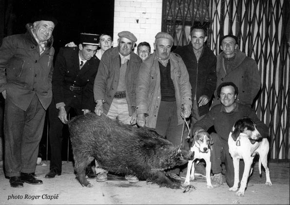 Les chasseurs ont tué un sanglier et posent devant la boucherie Taxil ( de gauche à droite: Etienne Fabret, Fernand Roux, Jules Codoul, Margaria, Roger Fabret, Gabriel Fabret, entre les chiens: Pierrot Taxil