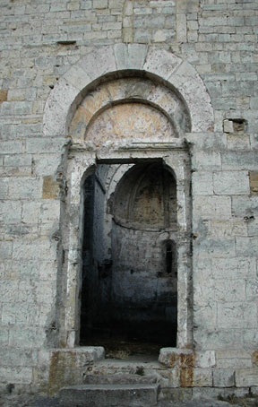 Façade Ouest,entrée principale de la chapelle, légérement désaxée. Porte au tympan couronné d'une double arcature