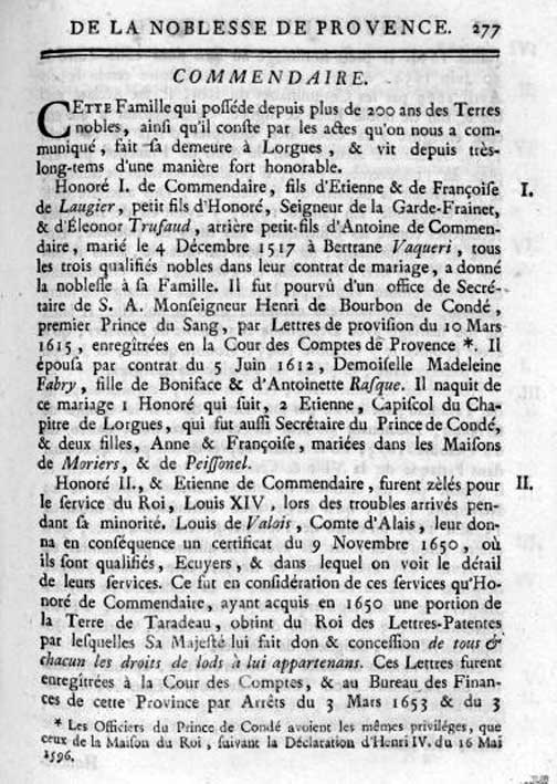 Extrait de "Histoire Héroïque et Universelle de la Noblesse de Provence". 1776