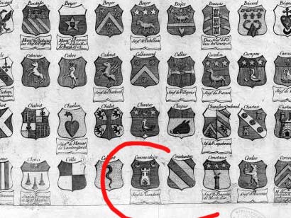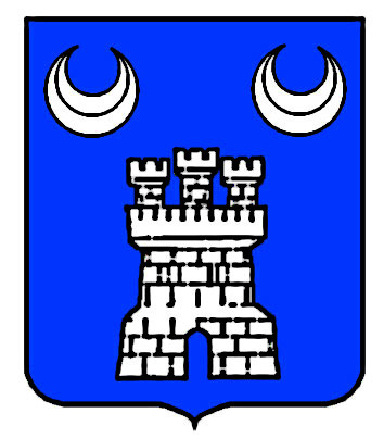 d'azur à une tour donjonnée de trois tourelles d'argent, maçonnée de sable, surmontée de deux croissants d'argent.