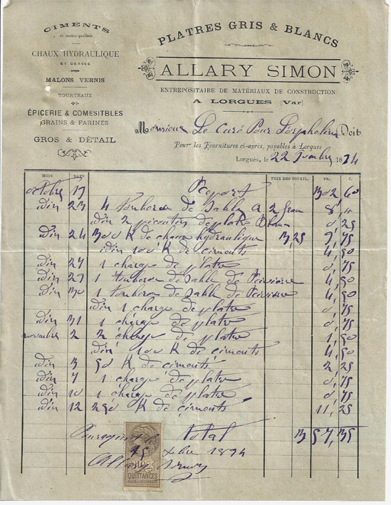 Allary Simon. Ciment de toutes qualités. Chaux hydraulique et grasse. Malons vernis. Tourteaux. Épicerie & comestibles. Grains et farines. Gros et détail