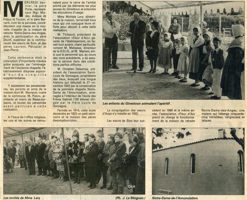Article du 06/12/1996 Une chapelle pour Notre-Dame La nouvelle chapelle de la maison de retraite Notre-Dame-des-Anges a été consacrée en présence de nombreux fidèles