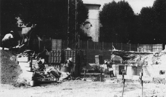 | " Ci-dessus , les écoles photographiées de l'autre côté de la rue. Cet espace avec son bassin d'arrosage était constitué alors de jardins cultivés. Il est aujourd'hui occupé par le groupe scolaire Emile Zola dont on voit ci-dessous le début des travaux de construction en 1988. " |