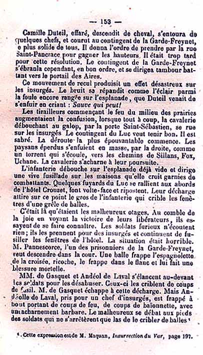 A Aups , l'attaque des troupes gouvernementales provoque la déroute des insurgés, inorganisés et mal encadrés. Les otages emmenés par les insurgés et consignés dans un hôtel, voient enfin leur libération proche.