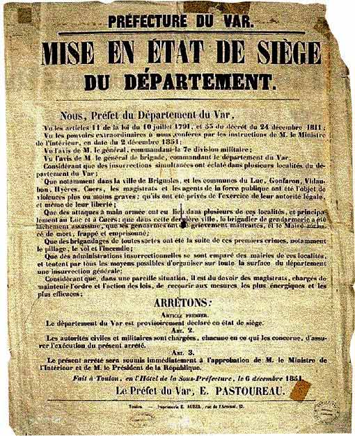 L'affiche de mise en état de siège du département du Var le 6 décembre 1851