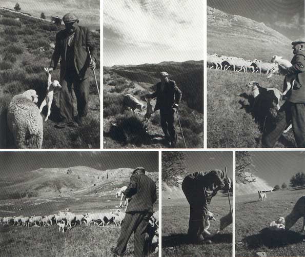 | "La descente le 13 octobre. Le troupeau a passé l'été en montagne. Deux bergers, Jacques Robion et Monsieur Gaston, ont vécu à 2000 mètres. Le troupeau est rassemblé une fois par semaine dans un parc limité par des planches. Les bergers vivent dans une sorte de petite grange. Transistor. Deux fois par semaine l'un d'eux descend à Beuil: tabac, pain, courrier. Les orages. Quand octobre approche encore une fois il faut être attentif aux brebis qui cherchent à prendre l'initiative du départ. Et puis le 13 octobre, rassemblement, mais les chèvres manquent à l'appel. Jacques Robion depuis l'aube a cherché dans la montagne. Le troupeau est maintenant difficile à contenir. Il faut partir. Les chèvres sont abandonnées. Elles passeront l'automne, l'hiver et le printemps dans la montagne-sauvages-, à la saison suivante certaines rejoindront le troupeau. Elles disparaissent pour la pluspart. " Le troupeau démarre et tout de suite la naissance d'un agneau provoquée probablement par l'émotion. Robion le père est venu pour le voyage. Et c'est lui qui emporte l'agneau. " |