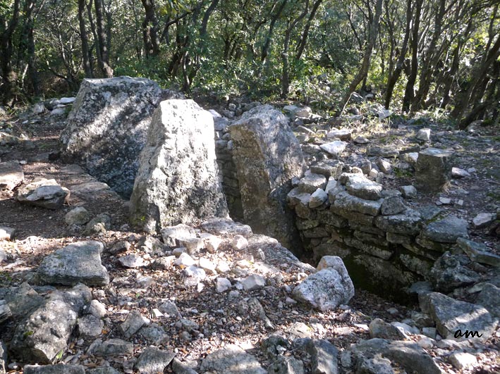 à l'est. Sa forme et ses dimensions rattachent la tombe de Peycervier aux dolmens à chambre carrée et à couloir orienté à l'ouest ou au sud-ouet de Provence Orientale. Peycervier comporte à la fois des éléments mégalithiques, c'est à dire de grosses dalles fichées dans le sol et un petit appareil en pierre séche. Il s'apparente en cela à de nombreux dolmens du Var et plus particulièrement, du fait de la présence de supports verticaux très robustes de même hauteur pouvant aisément recevoir une lourde dalle de couverture, à ceux de la Colle et de Maren, à Ampus, et de la Pierre de la Fée à Draguignan. Les matériaux employés dans la construction ont été empruntés aux assises calcaires jurassiques ( Rhétien) constituant la plus grande partie de la colline. Le dolmen de Peycervier et ceux, voisins de Roque d'Aille, à Lorgues,