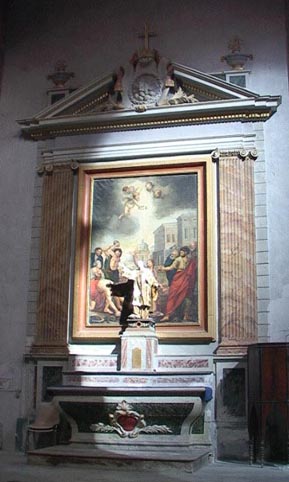 Autel et retable de Saint Etienne. Lapidation du martyr. Statue du Saint .