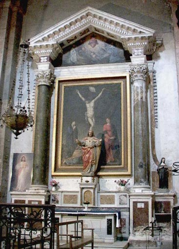 Autel, retable et tableau (XIXe siècle ). Crucifixion, et en haut apparition du Sacré-Coeur : Sainte Marguerite-Marie et le Bienheureux de la Colombière.