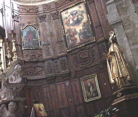 | Sur le registre inférieur : - toile de la Vierge à l'Enfant vénerée par Saint Martin et le Carme Saint Simon Stock recevant le scapulaire de Notre-Dame du Mont Carmel. - toile de I' Assomption. - toile de Saint Eloi en compagnie de Saint Pons de Cimiez et de Sainte Agathe. Sur le registre supérieur : - grande toile (XVIIIe siècle) : les pélerins d'Emmaüs. - grande toile (XVIIIe siècle) : Assomption de la Vierge entre deux tableaux figurant Martin (cavalier romain) et Martin (évêque). - grande toile : le sacrifice d' Abraham |