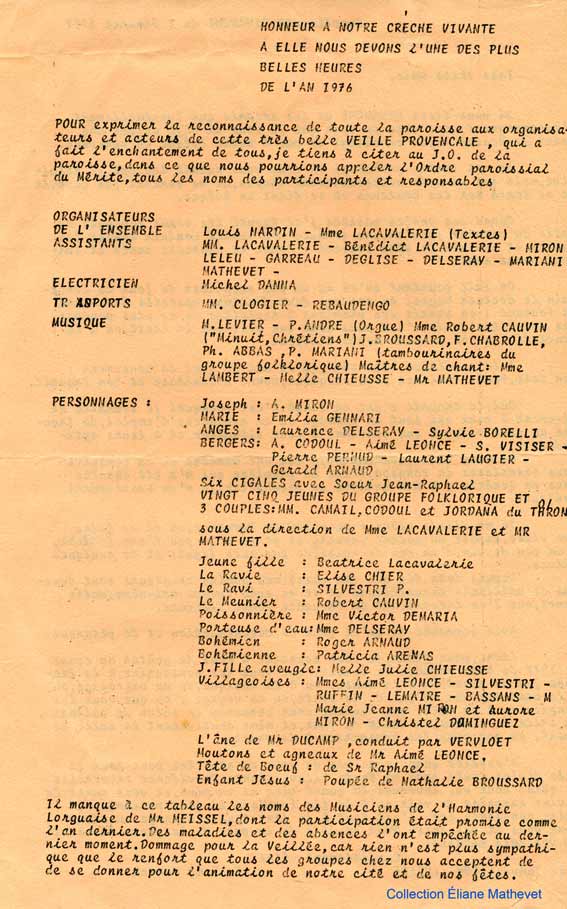 Collection Éliane MATHEVET 24 décembre 1976. La crèche vivante à l'église Extrait du bulletin paroissial . Père R Munsch Curé de Lorgues