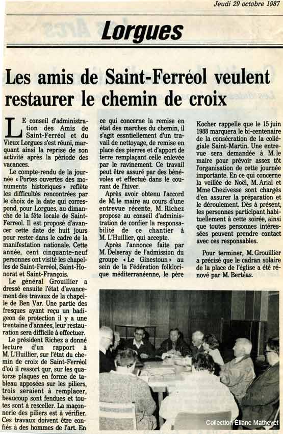 Collection Éliane MATHEVET Article Oct 1987. Amis de Saint-Ferréol et du Vieux Lorgues