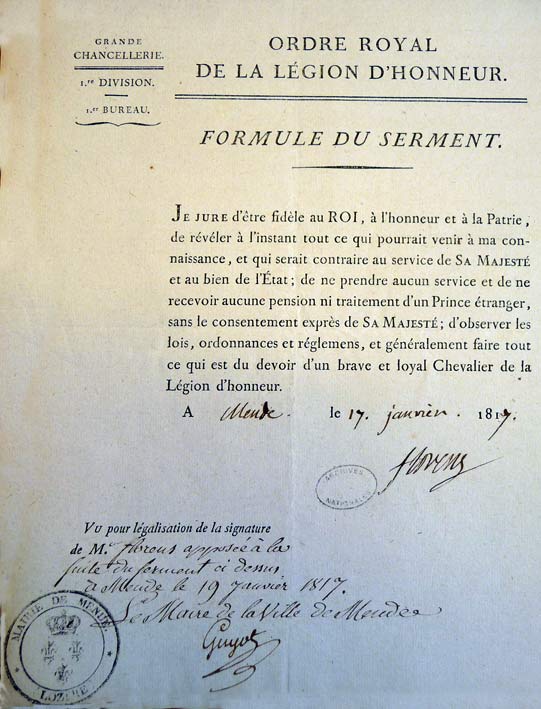 Serment de fidélité au Roi - ( Archives Nationales, Paris - Dossier Légion d'Honneur ). 17/01/1817