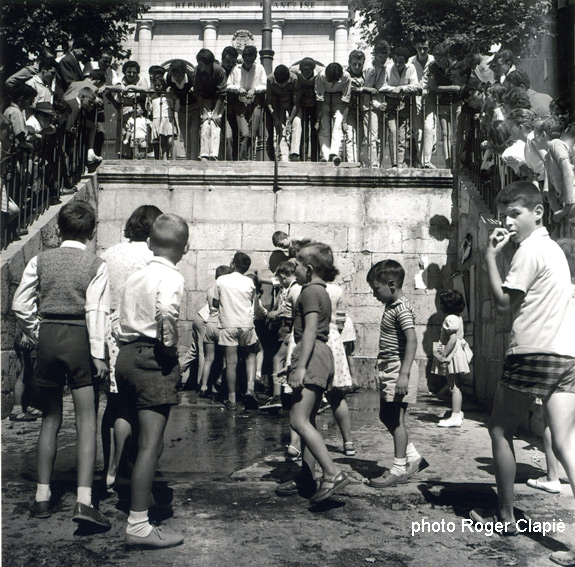 L'ancienne fontaine dans les années 1960, un jour de baptême. Cérémonie appréciée des enfants car à la sortie de l'église le parrain leur jetait des pièces de monnaie, mais il prenait souvent un malin plaisir à envoyer quelques poignées dans les fontaines. |