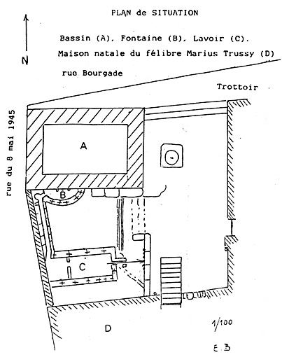 Le monument occupe le N° 358 du plan cadastral, à l'intersection des rues Bourgade et du 8 Mai 1945, autrefois ruelle des jardins puis des près. Il est isolé sur ses quatre faces et son grand axe est orienté ouest-est à un degré près. Il occupe l'angle nord-ouest d'un petit quadrilatère d'une surface de 100 m2 limité à l'est et au sud par les murs de deux anciens immeubles, à l' ouest par la rue du 8 Mai 1945, au nord, par la rue Bourgade. Les façades du monument sont biaises par rapport à l'alignement des rues et l'emprise de la construction déborde sur le trottoir de la rue Bourgade. A l'est de l' édifice, un passage large de 4 m. s'amorce par trois marches de construction récente et se prolonge par paliers, en pente vers le sud. Au sud de l'édifice, le sol est creusé et aplani à 2 m. 25 au dessous du niveau de la chaussée des rues; sa surface est occupée par un lavoir . |