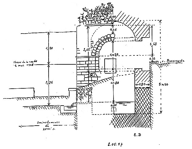 Les pieds-droits de1'arc externe sont constitués par le mur lui-même, ceux de l'arc interne par un dosseret qui repose sur un appui distinct, surélevé de 12 cm par rapport à celui de l' arc externe. Les arcades des grandes façades sont geminées, les sommiers distincts des arcs s'appuient, par l' intermédiaire d'une imposte commune, sur un pilier médian, de section en T. La voûte de l'édifice est présentement sans toiture, cette absence a transformé l' extrados en un jardin suspendu . L' ornementation est des plus discrètes, un bandeau et deux corniches. Le bandeau ceinture l'exterieur du monument et se confond avec les impostes des arcs. Il est de section trapezoïdale rectangle, sa face inférieure oblique est légèrement concave. Une corniche, en quart de rond à surface supérieure horizontale, saille au haut des petites façades est et ouest. Sur la partie sud de la façade " est '", une pierre, de tête carrée, occupe deux rangs du parement , le rang supérieur correspond à l'appui des arcs externes des ouvertures. La surface de la pierre est évidée entre deux méplats supérieur et inférieur et présente en son centre un orifice, aujourd'hui obturé. |