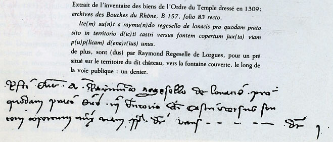| En l'absence de toute inscription, le dépouillement des archives locales et régionales fournit un certain nombre de points de repère sur l'histoire de cette fontaine qui bordait, au Moyen-Age, la voie de traversé de Lorgues par la grande route d'Avignon à Nice et à l'ltalie (1). La première mention trouvée date de 1309. Elle figure dans un inventaire des biens et des revenus des Templiers, dressé après l'abolition de l'Ordre (2). Parmi les nombreux biens sis à Lorgues, il est porté qu'un certain Raymond Regeselle était taxé d'un denier annuel pour un prè, proche de la fontaine couverte (3). Or, il n'y eut pas d'autre fontaine couverte à Lorgues. Il faudra attendre le XVIIe siècle pour trouver de nouvelles mentions de la fontaine dans les comptes-rendus des déliberations de la communauté de Lorgues. La plus ancienne paraît dater de 1645 (4), elle est due, comme la plupart de celles qui suivront, aux plaintes des habitants contre les souillures qui polluent leur fontaine. Jusqu'à nos jours, pollution, tarissement, captage clandestin, difficulté de l'accés reviennent, sans cesse, à l'ordre du jour des délibérations. II serait fastidieux d'en faire le catalogue. Quelques faits méritent cependant d'être relevés. | |