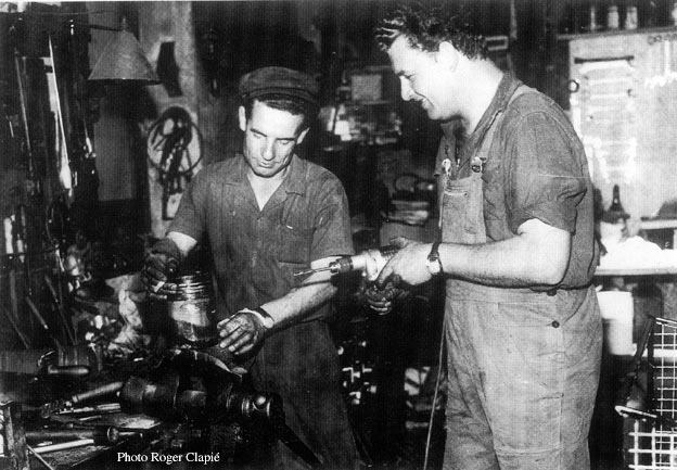 M. Géronimo (à gauche) avec René Girard, dans son garage avenue Allongue (il avait repris l'atelier de M. Troin maréchal-ferrant)