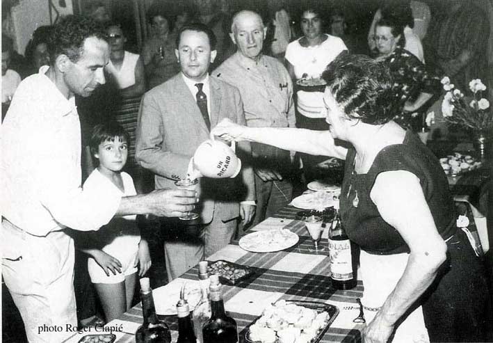 Madame Scoto, du Provençal , sert un pastis à M. Fabret sous l'oeil attentif du maire Pierre Viton