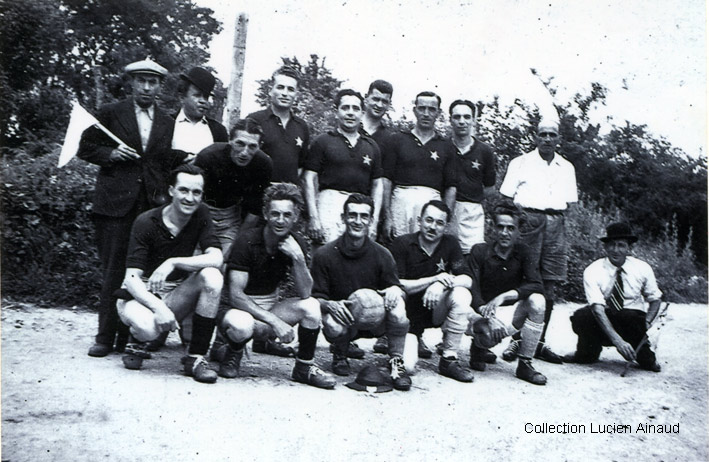 " L'équipe de foot des vétérans en 1947 : au premier rang Taxil, Tornior, Boyer, Pieplu, Destruc, « papillon », Derossi.