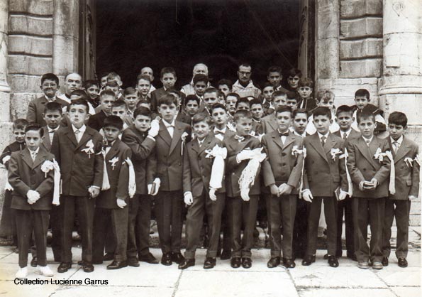 Les communiants de 1957 autour du Père Jean de Mathas curé de Lorgues et du Père Etienne à gauche, vicaire.