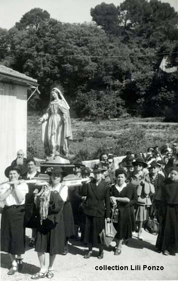 "La procession de la Vierge, les porteuses sont : Madame Meyer devant à gauche, mère de Jean Meyer, sa belle sœur devant à droite. Il ya aussi Louisette Meyer à côté de sa mère derrière à droite."