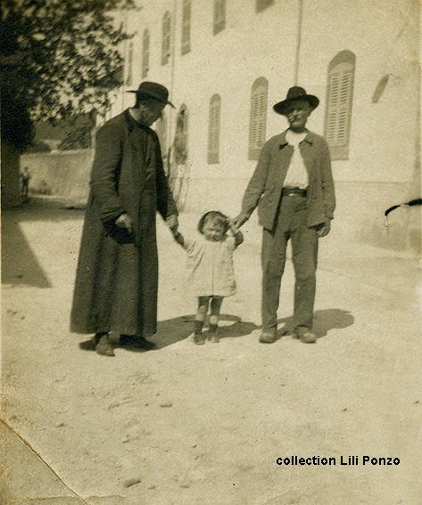 " Devant l’Hôpital avec l’abbé Gros et mon grand-père Joseph Codoul, des Pelicans :« Tonton labé, Lili, Pépé». L’abbé Gros fut prêtre à Lorgues sous le curé Salomon, puis a passé sa retraite dans sa maison de Lorgues, place St François. |
