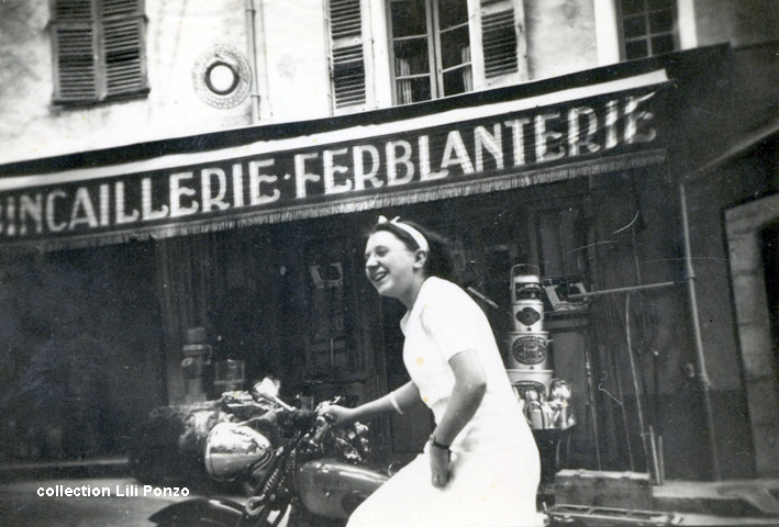 " Moi, devant la quincaillerie-ferblanterie Alavena , place du Revelin . Sur la moto de mon père, en 1939"
