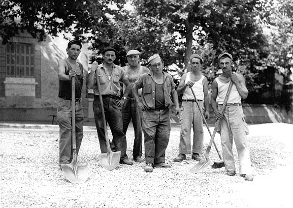 | L'équipe des cantonniers de Lorgues en 1959 de gauche à droite: Henri Boeuf ( Ritou ), Alfred Bégliatti ( Manon ), Jean Bonelli ( Jeannot), Noël Mathieu (Biscot), Justin Roux ( Titin ), Emmanuel Marcel ( Manou ) . |