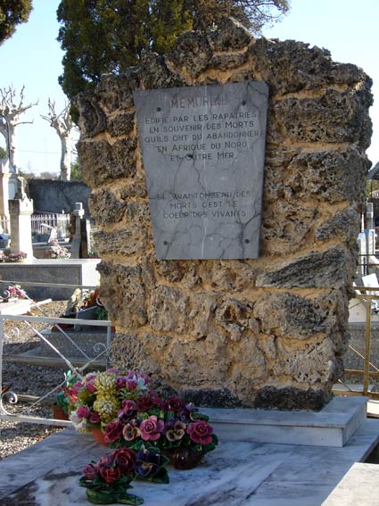 "Mémorial .Edifié par les rapariés en souvenir des morts qu'ils ont du abandonner en Afrique du Nord et Outre Mer.