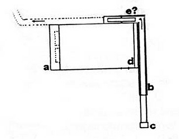 a : mur de force et emplacement des chapelles détruites b : mur de propriété avec canal des moulins au sommet c : pillier du portail d : réservoir ? e : emplacement de la roue hydraulique |