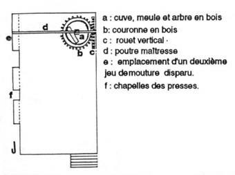 | Transformé en restaurant et particulièrement bien restauré, il conserve deux chapelles, des presses à bras avec leurs poutres dont l'une avec sa vis en bois ainsi qu'une meule avec un jeu complet de mécanisme (cuve, arbre, rouet ...). Il possédait à l'origine deux cuves de broyage. |