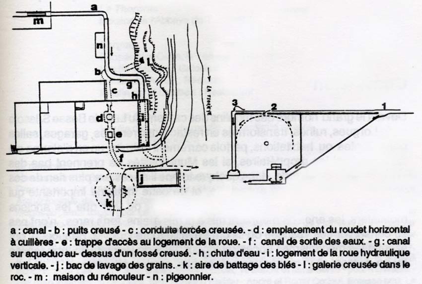 | Ce moulin avaient de grandes dimensions, la conduite forcée de 7 Mètres de hauteur taillée dans le roc conduisait au logement du roudet horizontal à cuillères qui a fontionné jusqu'en 1854, le logement de la grande roue verticale a plus de 10 mètres de haut. Au dessus de ce grand bâtiment on voit une autre bâtisse qui devait être transformée en moulin : on remarque que le canal la traverse, mais l'autorisation de construire le moulin a été refusée, si bien qu'on y installa en 1864 une meule à aiguiser actionnée par une petite roue à eau. |