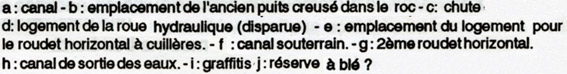 | 14 e siècle Le plus ancien. A fonctionné jusqu'en 1932. détruit par un incendie. Fut transformé aux XVII et XVIIIe siècles. On y voit encore le canal d'amenée des eaux , le logement de la grande roue hydraulique verticale. |