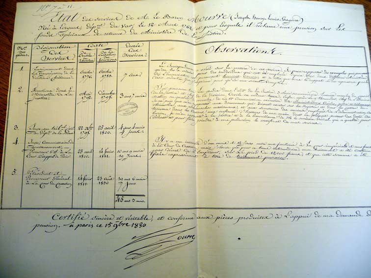 État de service de Joseph Mourre - ( Archives nationales . Paris. Dossiers Magistrats. Demande de retraite )
