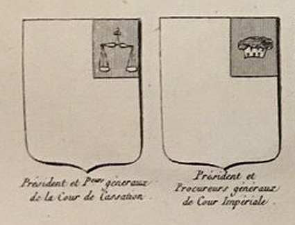 Les Barons Présidents et Procureurs généraux de la Cour de Cassation arboraient sur leur blason un Franc-quartier ou canton, sénestre de gueules, chargé d'une balance d'argent. |