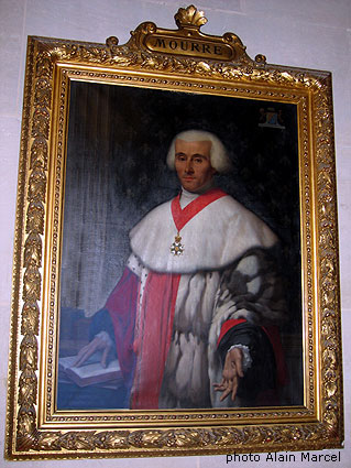 | La galerie de la Première Chambre civile Réalisée d'après les plans de Duc, ses boiseries s'inspirent du style en vogue au 17ème siècle. Des lambris entourent de grands cadres dans lesquels sont placés des portraits sur châssis. On peut y voir, du côté des fenêtres, trois portraits dus à René Gilbert (1854 -1914), dont celui-ci de Joseph-Henri Mourre (1762-1832), président de la chambre civile (1811), puis procureur général (1815-1830) |