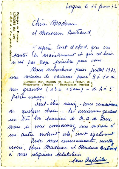 Carte envoyée par soeur Raphaële pour organiser les vancances d'été 1972